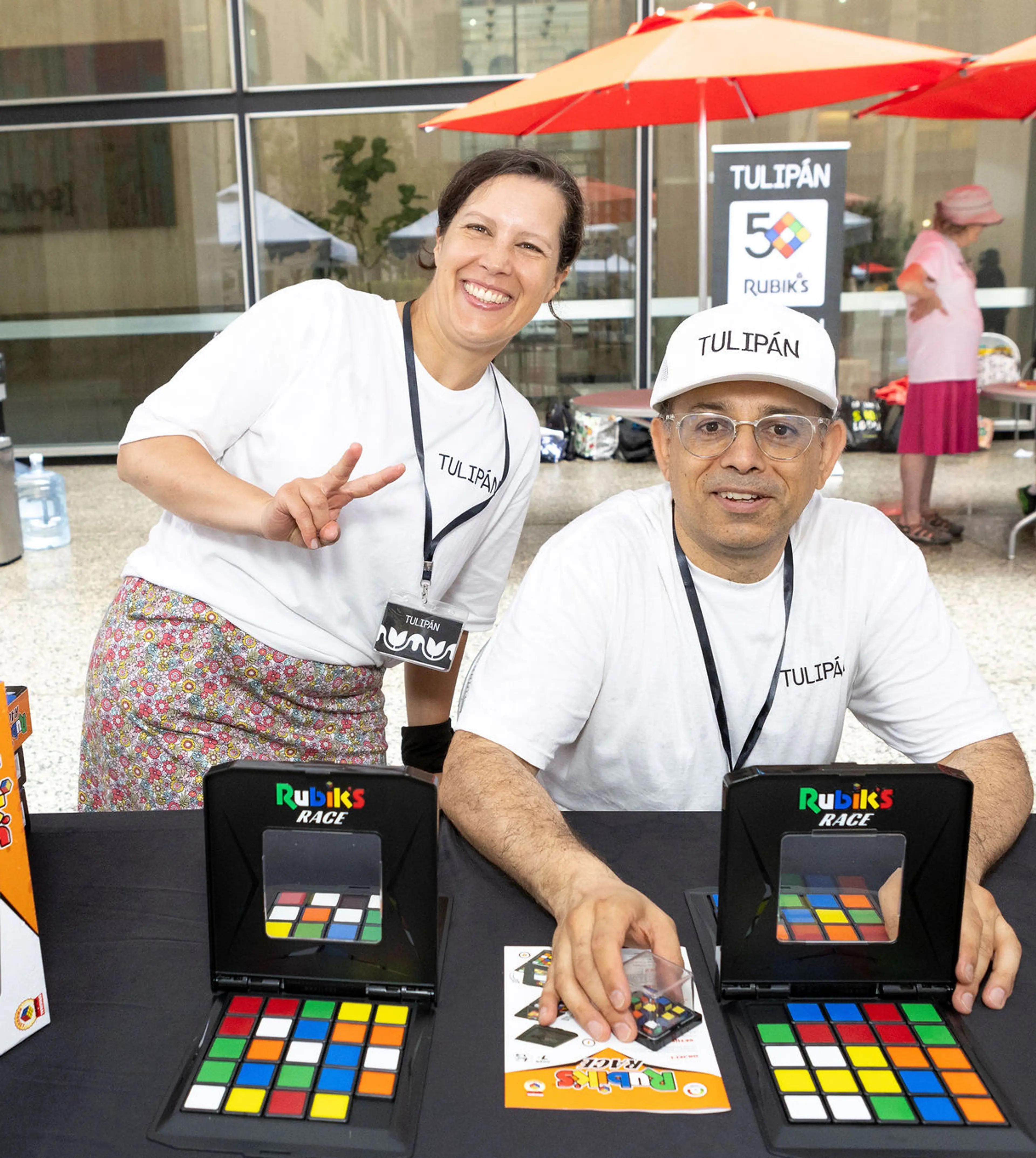 A volunteer in a Tulipan shirt holdung Rubiks cubes